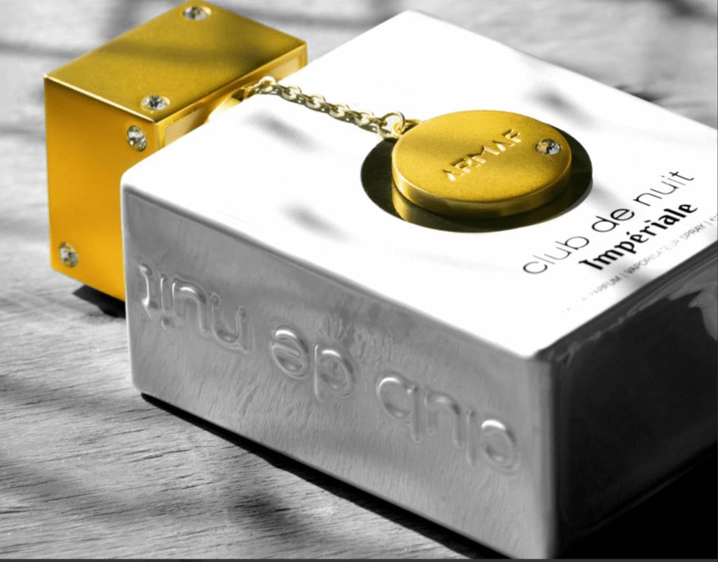Thiết kế chai nước hoa Club De Nuit White Imperiale đẹp sặc sỡ ánh kim, thể hiện cô nàng kiêu sa, xinh đẹp, sự lộng lẫy khiến bạn bị thôi miên bởi những chuyển động rất khẽ trên làn da.