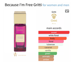 Cuối cùng, khi mùi hương nước hoa Gritti Because I’m Free dần chuyển mình về hương cuối, sự ấm áp và ngọt ngào của caramel và vanilla xuất hiện, như một cái ôm ấm áp và êm dịu. Hương caramel mang lại sự quyến rũ, gợi nhớ đến những chiếc bánh ngọt vừa mới ra lò, trong khi vanilla tạo nên một lớp nền mịn màng và dễ chịu, khiến cho tổng thể mùi hương trở nên lôi cuốn hơn bao giờ hết. Sự hiện diện của nhựa hổ phách thêm vào chiều sâu và sự bí ẩn, như một dấu ấn không thể quên, tạo nên cảm giác sang trọng và quyến rũ cho người sử dụng.