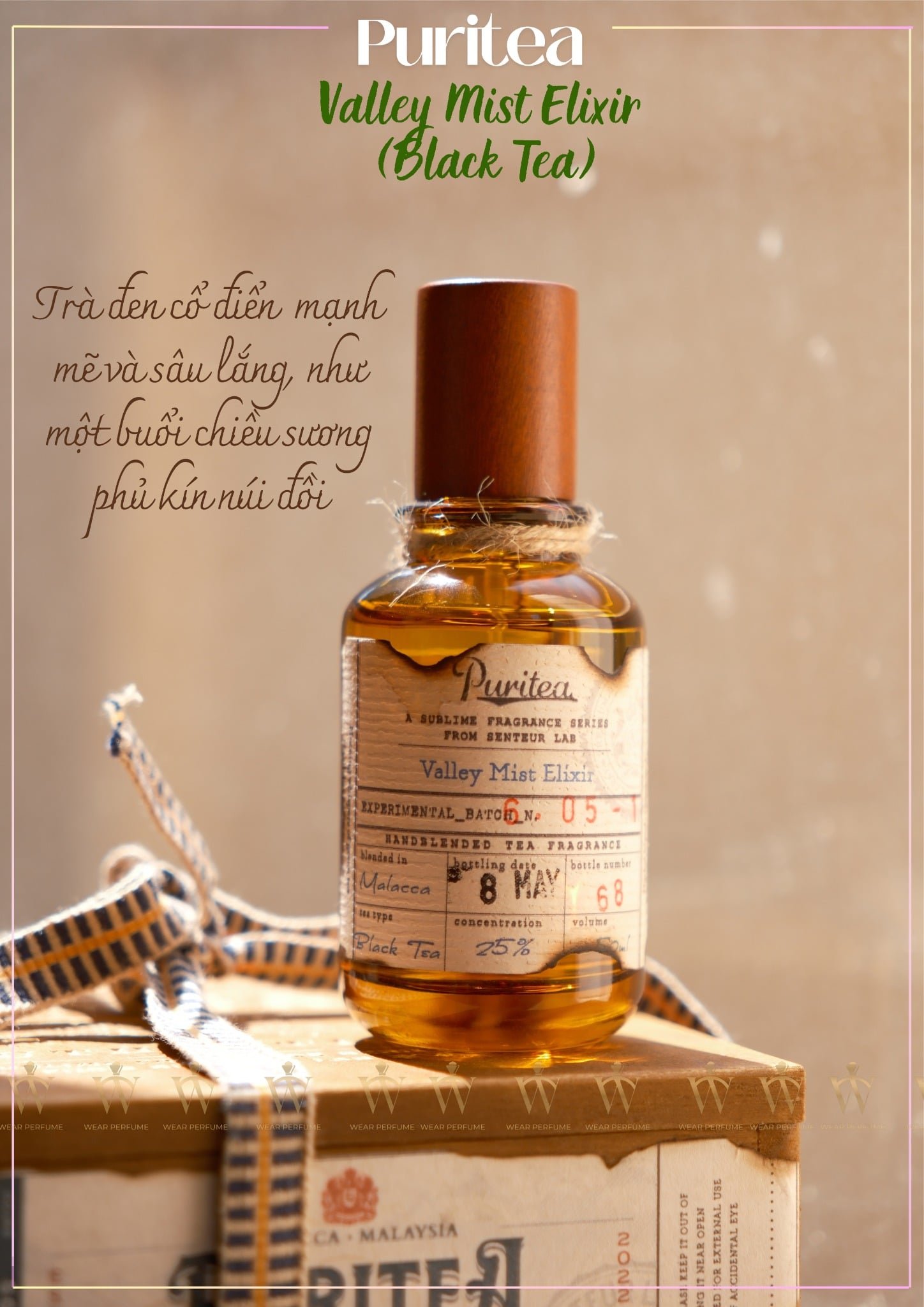 Nước hoa Puritea Black Tea (Valley Mist Elixir) là một tác phẩm nghệ thuật hương thơm lấy cảm hứng từ vẻ đẹp huyền bí của vùng cao nguyên Darjeeling. Mỗi giọt hương đều mang đến một hành trình khám phá đầy mê hoặc, đưa bạn đến những vườn trà xanh mướt và những khu rừng nguyên sinh. Với sự kết hợp tinh tế giữa các thành phần tự nhiên, Puritea Black Tea không chỉ là một mùi hương, mà còn là một trải nghiệm cảm xúc tinh tế.